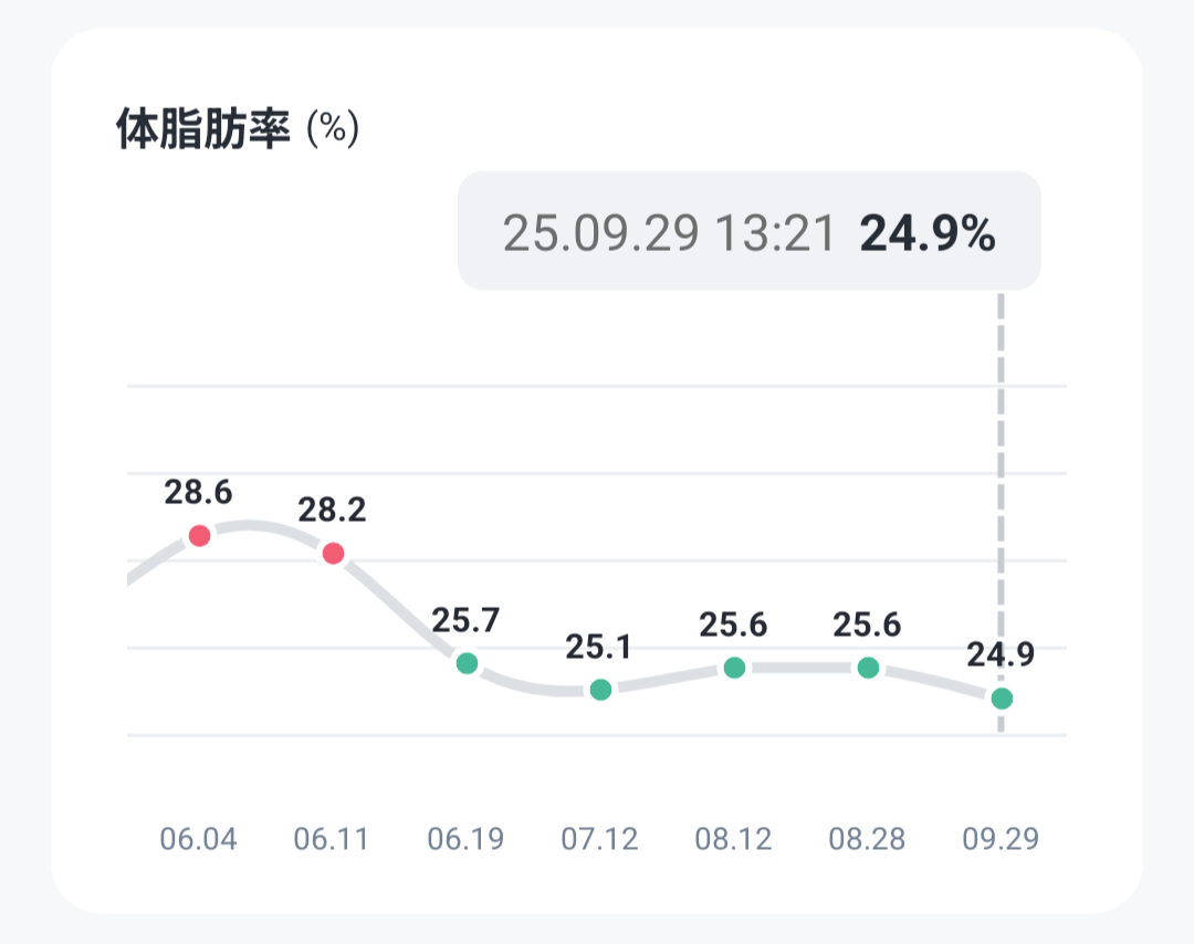| After (9/29) | 50.9 kg | 24.9 % | 35.9 kg | 1,196 kcal |
